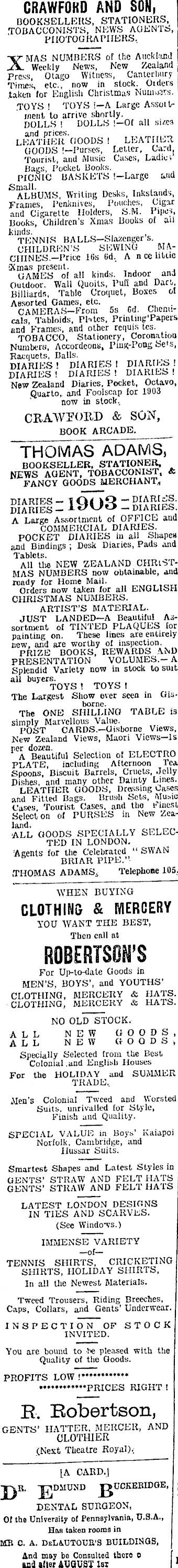 CRAWFOKD AND SON, BOOKSELLERS, STATIONERS, TOBACCONISTS, NEWS AGENTS, PIIOTOGRA [TIERS. XMAS NUMBERS of the Auckland Weekly News, New Zealand Press, Otago Witness, Canterbury Times, etc., now in stock. Orders taken for English Christmas Numbers. TOYS ! TOYS i—A Large Assoiir rnent to arrive shortly. BOLLS ! DOLLS !—Of all sizes and prices. „ LEATHER GOODS! LEATHER GOODS !—Purses, Letter, Card, Tourist, and Music Cases, Ladies’ Bags, Pocket Books. PICNIC BASKETS !—Large and Small. , , , , ALBUMS, Writing Desks, Inkstands, Frames, Penknives, Pouches, Cigar and Cigarette Holders, S.M. Pipes, Books, Children’s Xmas Books of atl kinds. TENNIS BALLS—Slazenger s. CHILDREN’S SEWING MACHINES.—Price His (id. A nce lituc Xmas present. GAMES of all kinds. Indoor and Outdoor. Wall Quoits, Pull and Dart, Billiards, Table Croquet, Boxes ol Assorted Games, etc. CAMERAS—From 5s Gd. Chemicals, Tabloids, Pl-.tcs, Printing'Papers and Frames, and other requis tes. TOBACCO, Stationery, Coronatiou Numbers, Accordcom;, Ping-Pong Se's, Racquets, Balls. DIARIES! DIARIES! DI ARIEL. ! DIARIES ! DIARIES ! DIARIES ! New Zealand Diaries, Pocket, Octavo, Quarto, and Foolscap for 1903 now in stock., CRAWFORD & SON, BOOK ARCADE. THOMAS ADAMS, bookseller, stationer, NEWS AGENT, TOBACCONIST, & * r<nAno MPDHUANT. FANCY GOODS MERCHANT* DIARIES - iQj jQ-DIARIES. IS- 1 tJVJ’O _ DIARIES— —DIARIES A Large Assortment ol OFFICE and COMMERCIAL DIARIES. POCKET DIARIES in all Shapen and Bindings ; Desk Diaries, Pads and Tablets. All the NEW ZEALAND CHRISTMAS NUMBERS now obtainable, and ready for Home Mail. Orders now taken for all ENGLISH CHRISTMAS NUMBERS. ARTIST'S MATERIAL. JUST LANDED—A Beautiful Assortment ol TINTED PLAQUES lor painting on. These lines are entirely new, and are worthy of inspection. PRIZE BOOKS, REWARDS AND PRESENTATION VOLUMES.- A Splendid Variety now in stock to suit all buyers. TOYS ! TOYS ! The Largest Show ever seen in Gisborne. The ONE SHILLING TABLE is simply Marvellous Value. POST CARDS.—Gisborne Views, New Zealand Views, Maori Views—ls per dozen. A Beautiful Selection of ELECTRO PLATE, including Afternoon Tea Spoons, Biscuit Barrels, Cruets, Jelly Dishes, and many other Dainty Lines. LEATHER GOODS, Dressing Oases and Fitted Bags. Brush Sets, Music Cases, Tourist Cases, and the Finest Select on of PURSES in New Zealand. ALL GOODS SPECIALLY SELECTED IN LONDON. Agents for the Celebrated “ SWAN BRIAR PIPE." THOMAS ADAMS. Telephone 105. WHEN BUYING CLOTHING & MERCERY YOU WANT THE BEST, Then call at 'S For Up-to-date Goods in MEN’S, BOYS’, and YOUTHS’ CLOTHING, MERCERY & HATS. CLOTHING, MERCERY & HATS. NO OLD STOCK. ALL NEW GOODS, ALL NEW GOODS, Specially Selected from the Best Colonial .and English Houses For the HOLIDAY and SUMMER TRADE, Men's Colonial Tweed and Worsted Suits, unrivalled for Style, Finish and Quality. SPECIAL VALUE in Boys’ Kaiapoi Norfolk, Cambridge, and Hussar Suits. Smartest Shapes and Latest Styles in GENTS’ STRAW AND FELT HATS GENTS’ STRAW AND FELT HATS LATEST LONDON DESIGNS IN TIES AND SCARVES. (See Windows.) IMMENSE VARIETY —of— TENNIS SHIRTS, CRICKETING SHIRTS, HOLIDAY SHIRTS, In all the Newest Materials. Tweed Trousers, Riding Breeches, Caps, Collars, and Gents’ Underwear. INSPECTION OF STOCK INVITED. You are bound to be pleased with the Quality of the Goods. PROFITS LOW !*<***•***•♦* ,*„,„.*,« pRICES RIGHT ! R. Robertson, GENTS’ HATTER, MERCER, AND OLOTI-IIER (Next Theatre Royal), D 1 [A CARD. | jgUCKEBIDGE, DENTAL SURGEON, Of the University of Pennsylvania, D.S.A., Hae taken rooms in MR C. A. DeLAUTOUE'S BUILDINGS, And may be Consulted there o and after AUGUST lei