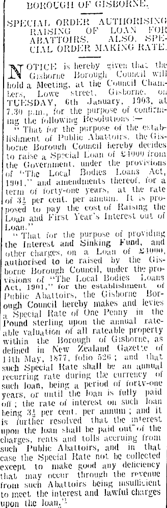 BOKOUGII UP GIS BOR NIL SI’KCI \L ORDKK AUTHORISING RAISING OF LOAN FOR ABATTOIRS. ALSO. SPFCIAL ORDKR MAKING KATLL IVT OTICF is hereby given that the Gisborne Borough Council will hold a Meeting, at tin; Council Chambers, Lowe street, Gisborne, on TUKSDAY, Cth January. 1003, at 7.30 p.m., for the purpose of confirming tl.e followin'.: Resolutions “ That for the purpose of the establishment of Public Abattoirs, the Gisborne Boromrli Council hereby decides to raise a Special Loan of LIUUb from the Government, under the provisions of ''The Local Bodies Loans Act, 1 <jij 1 ," and amendments thereof, lor a term' of forty-one years, at the rate of 3.1 per cent, per annum. It is proposed to pay the tost of Raising the Loan and First Year's Interest out oi Loan." “ That for the purpose oi providing the Interest and Sinking Fund, and other charges, on a Loan of , authorised to be raised by the Gisborne Borough Council, under tile provisions of "1 he Local Bodies l.oans Act, 1301,” for the establishment of Public Abattoirs, the Gisborne Borough Council hereby makes and levies a Special Hate of One Penny in the Pound sterling upon the annual rateable valuation of all rateable property within the Borough of Gisborne, as defined in New Zealand Gazette of tlth May, 1377, folio 5211 ; and that such Special Kate shall he an annual recurring rate during the currency oi such loan, being a period of fortv-one years, or until the loan is fully paid oil ; the rate oi interest on such loan being .31 per cent, per annum; and it is further resolved that the interest upon the loan shall fie paid out of the charges, rents and tolls accruing iroin sueir Public Abattoirs, and in that case the Special Kate not he collected except in make good any deliciency that may occur through the revenue from such Abattoirs being liisuilh.ient to meet, the interest and lawful charges upon the loan,' 1