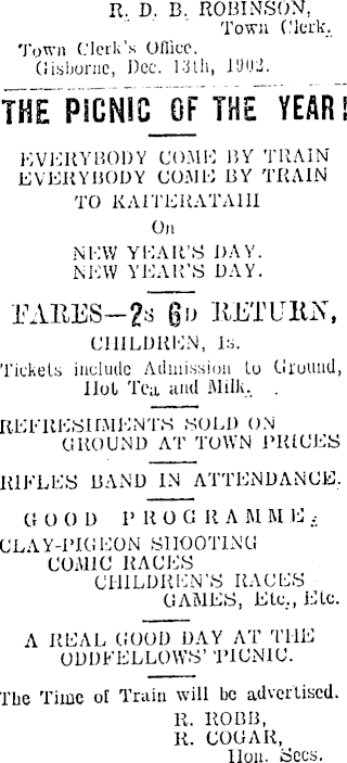 R. D. B, ROBINSON, Town Clerk. Town Clerk's Office, Gisborne, Dec. 13th, 11)03. THE"PICNIC OF THE YEAR! EVERYBODY COME BY TRAIN EVERYBODY CO.ME BY TRAIN TO KAITERATAIII On NEW YEAR’S DAY. NEW YEAR’S DAY. FARES—2s (Jd RETURN, CHILDREN, Is. Tickets include Admission to Cl round, Hot Tea and Milk. . REFRESHMENTS SOLD ON GROUND AT TOWN RIUCES RIFLES BAND IN ATTENDANCE. GOOD BROGRA MME . : CLAY-BIG EON SHOOTING COMIC RACES CHILDREN’S RACES GAMES, Etc., Etc. A REAL GOOD DAY AT THE ODDFELLOWS’ ’BIONIC. The Time ot Train will he advertised. R. ROBB, R. COGAIi, lion. Secs.