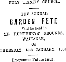 holy trinity church. THE ANNUAL GARDEN FETE Will be hold in MR HUMPHREYS' GROUNDS. WAIKANAE, On THURSDAY, 15th JANUARY, IUO3 Programme Future Issue.
