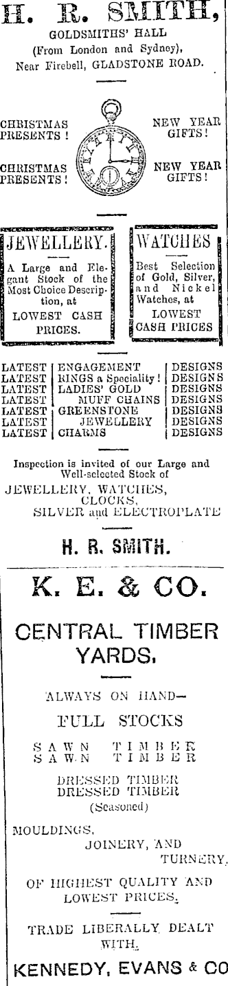 9 GOLDSMITHS’ HALL (From London and Sydney), Near Firebell, GLADSTONE ROAD. CHEISTMAS PRESENTS ! CHUISTMAS PRESENTS! f * NEW YEAR GIFTS! NEW YEAR GIFTS ! JEWELLERY. A Large and Elegant Stock of the j Most Choice Description, at I LOWEST CASH PRICES. gMBBE3W.B!HUMMt«9BEI WATCHES Best Selection of Gold, Silver, and Nickel Watches, at LOWEST CASH PRICES LATEST LATEST LATEST LATEST LATEST LATEST LATEST ENGAGEMENT KINGS a Speciality! LADIES’ GOLD MUFF CHAINS GREENSTONE JEWELLERY CHARMS DESIGNS DESIGNS DESIGNS DESIGNS DESIGN 3 DESIGNS DESIGNS Inspection is invited of our Large and Well-selected Stock of JEWELLERY, WATCHES, CLOCKS, SILVER ami ELEC TROLL ATE H. R. SiViSTH. K. E. & COr CENTRAL TIMBER YARDS, ALWAYS ON HAND—TULL STOCKS SAWNTI M II E K •S A W- N T I M B E R DRESSED TIMBER DRESSED TIMBER (Seasoned) MOULDINGS, JOINERY, AND TURNERY, OF HIGHEST QUALITY AND LOWEST PRICES. TRADE LIBERALLY DEALT WITH. KENNEDY, EVANS & CO