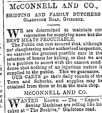 McConnell and co., SHIPPING AND FAMILY BUTCHERS Gladstone Road, Gisborne. WE are determined to maintain onr reputation lor supplying none but the BEST MEATS PROCURABLE. The Public can rest assured that, although not slaughtering under authorised inspection, we exercise the greatest possible care in the selection of beasts for killing, so that we are in a position to assert with the utmost confidence that nothing of an injurious nature is supplied to the public. This we guarantee. OUR CARTS go their daily rounds of the Town and Suburbs, and supplies may be obtained from them or frczn the main shop. mcconnell and co. ANTED Known The “ Expert ” Sewing Machines are selling like hot cakes at “ The Beehive," Gladstone road.