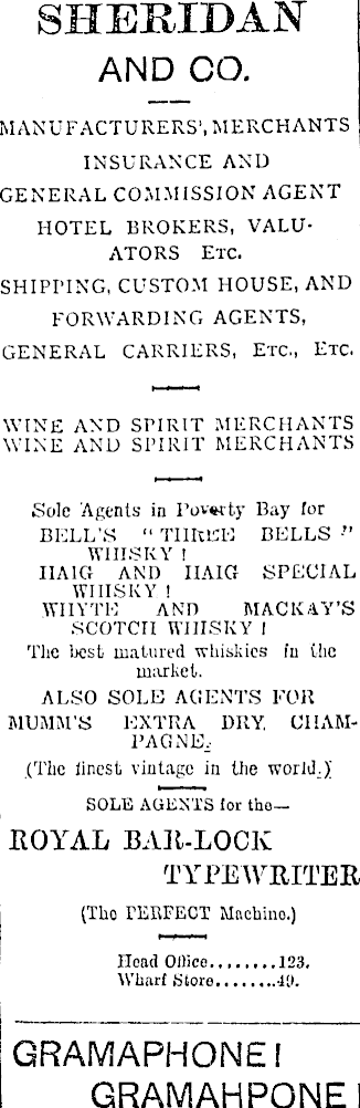 SHERIDAN AND CO. MANUFACTURERS', MERCHANTS INSURANCE AND GENERAL COMMISSION AGENT HOTEL BROKERS, VALUATORS Etc. SHIPPING, CUSTOM HOUSE, AND FORWARDING AGENTS, GENERAL CARRIERS, Etc., Etc. WINE AND SPIRIT MERCHANTS WINE AND SPIRIT MERCHANTS Sole Agents in Poverty Bay for BELL’S “ THREE BELLS •” WIIISKY ! 11A1G AND HAIG SPECIAL WHISKY ! WHYTE AND MAC KAY’S SCOTCH WHISKY I The best, matured whiskies in the market. ALSO SOLE AGENTS FOR MUMM’S EXTRA DRY. CHAMPAGNE, (The linest vintage in the world ) SOLE AGENTS lor the— ROYAL BAR-LQCK TYPEWRITER (Tko PERFECT Macliino.) Plead Oilice 123. Wharf Store -iy. GRAMAPHONEI GRAMAHPONE 1