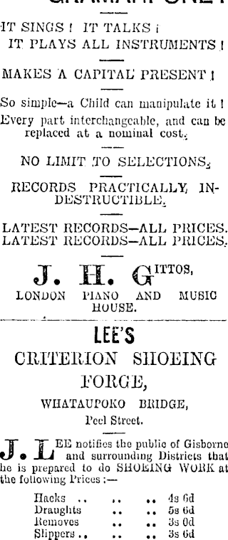 il s/ ii ii vy i iu. i IT SING'S ! IT TALKS i IT PLAYS ALL INSTRUMENTS ! MAKES A CAPITAL PRESENT I So simple—a Child can manipulate it ! Every part interchangeable, and can be replaced at a nominal cost-.. NO LIMIT TO SELECTIONS* RECORDS PRACTICALLY INDESTRUCTIBLE. LATEST RECORDS-ALL PRICES. LATEST RECORDS-ALL PRICES. j. h 7 g ittos - LONDON PIANO AND MUSIC HOUSE. LEE’S CRITERION SHOEING EOItOEj WHATAUPOKO BRIDGE, l’eel Street. JTT EE notifies the public of Gisborne • I J and surrounding Districts that he is prepared to do SHOEING WORK at