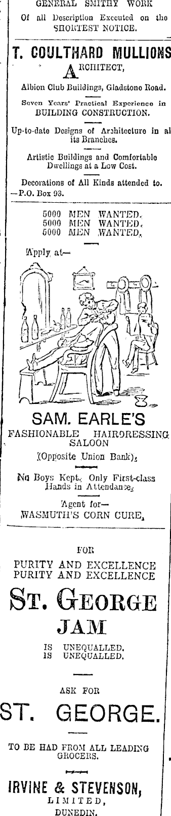 GENERAL SMITHY WORK Of all Description Executed on the SHORTEST NOTICE. T. COULTHARD MULUONS, ' RCIIITECT, Albion Club Buildings, Gladstone Road. Seven Years’ Practical Experience in BUILDING CONSTRUCTION. Up-to-date Dosigns of Anhitocturo in all its Branches. Artistic Buildings and Comfortable Dwellings at a Low Cost. Decorations of All Kinds attended to. -P.O. Box 93. 0000 MEN WANTED. 5000 MEN WANTED, 5000 MEN WANTED, Apply at—Oh m nu r\L= 8, SAM. EARLE’S FASHIONABLE HAIRDRESSING SALOON [(Opposite Union Banh^ No Boy;; Kept, Only First-class Hands in Attendance,'Agent for— WASMUTH’S CORN CURE, FOR PURITY AND EXCELLENCE PURITY AND EXCELLENCE St. George JAM IS UNEQUALLED. IS UNEQUALLED. ASK FOR ST. GEORGE. TO BE HAD FROM ALL LEADING GROCERS. IRVINE & STEVENSON. LIMITED, DUNEDIN.
