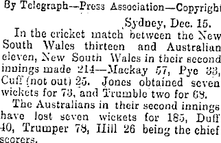 By Telegraph—Pros3 Association—Copyright .Sydney, Dec. 15. In the cricket match between the New South Wales thirteen and Australian eleven, New South Wales in their second innings made 214—Mackay 07, Pye 33, Cuff (not out) 20. Jones obtained seven wickets for 73, and Trumbio two for 68. The Australians in their second innings have lost seven wicaets for 180, Duff 40, Trumpet- 78, Iliil 26 berng the chief scorers.