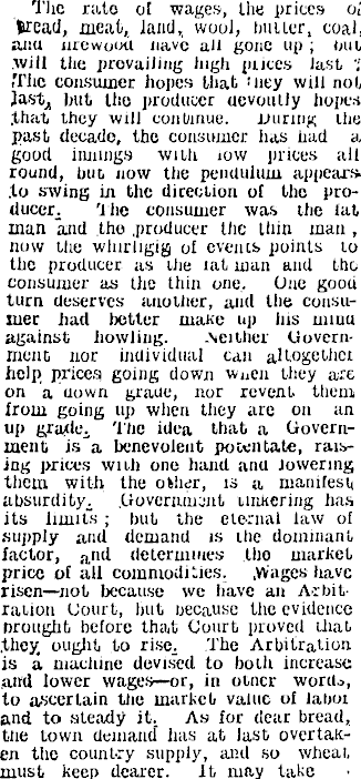 The rate ot wages, the prices o i Tircad, meal/, land, wool, tmitcr, coal, ana iirewootl nave all gone up ; put, will tiie prevailing high prices last iThc consumer hopes that ; liey will not last,, hut tiie producer devoutly hopes .that they will continue. miring the past decade, the consumer has had a good innings with low prices all round, hut now the pendulum appears, to swing in the direction of the producer The consumer was the lat man and the .producer the thin man , now the whirligig of events points to the producer as the lat man and the consumer as the thin one. One good turn deserves- another, and the consumer had better inane up iiis unuu against howling. -Neither Government nor individual can altogether help prices going down wuen they are on a uown grace, nor revent them from going up when they are on an lip grade. The idea that a Government is a benevolent potentate, raising prices with one hand anu lowering them with the other, is a manifest absurdity.. Government unnering has its limit's ; Put the eternal law ol supply and demand is the dominant factor, aml determines tho market price of all commodities. .Wages have risen—not because we have an Arbitration Court, hut oecatisc the evidence brought before that Court proved that .they, ought to rise. The Arbitration is a machine devised to both increase and lower wages—or, in olncr word-., to ascertain tiie market value of labor and to steady it. As for dear bread, the town demand" has at last overtaken the country supply, and so wheat must keep dearer. It may take
