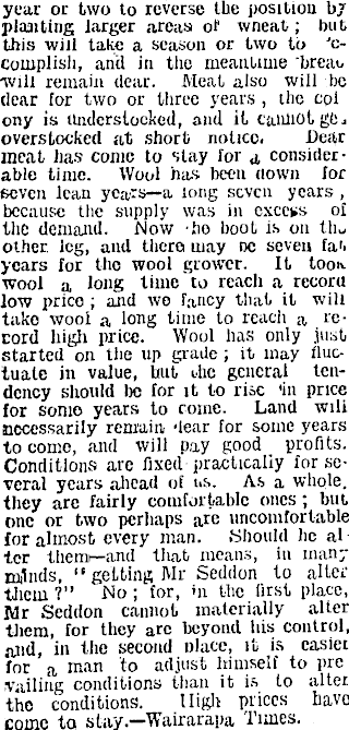 year or two to reverse the position by planting larger areas of wneat; but this will take a season or two to ’ccomplish, anil in the meantime Treat, will remain dear. Meat also will be dear for two or three years , the col ony is Understocked, and it cauliotge, overstocked at short notice, Dear meat has come to stay for a considerable time. Wool has been down for seven lean years—a long seven years , because the supply was in excess of the demand. Now ho hoot is on tli„ other, leg, and there may nc seven fat years for the wool grower. It toon wool a, long time to reach a record low prico ; and wo fancy that it will take wooi a long time to reach a record high price. Wool has only just started on tiie up grade ; it may fluctuate in value, hut die general tendency should he for it to rise ‘in price for somo years to come. Land wiii necessarily remain dear for some years to come, and will pay good profits. Conditions are fixed practically for several years ahead of us. As a whole, they arc fairly comfortable ones ; hut one or two perhaps are uncomfortable for almost every man. .Should lie al ter them—and that means, in many minds, “ geLting Mr Seddon to alter them 7” No ; for, m the first place, Mr Seddon cannot materially alter them, for they arc beyond his control, and, in the second Diace, it is easier for a man to adjust himself to pro vailing conditions than it is to alter the conditions. High prices bavo Come to stay.—Wairarapa I’imes.