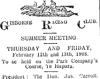 aCKnG SUMMER MEETING. THURSDAY AND FRIDAY, February 12th and 13th, 11HJ3. To be held on the Park Company’s Course, 'ie Hapara. President : The Hon. Jas. Carroll.