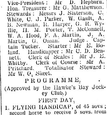 Vice-President : Air D. Hepburn. I-lon. Treasurer : Mr Cf. Matthewson. Stewards: Messrs J. Sisterson, C. White, 0. J. Parker, W. Gault, A. B. Newman, lc. Harper, G. R. Wyllie, H. Ai. Porter, 'l'. AicConnell, W. A. Hood, K. A. Alarliu, J ; A. lUartin, 0. Oman. Judge. Captain Tucker. Starter :Mr K. Boland. Handicapper :MrC. D. Bennett. Clerk ol Scales: Air J. H. Whitby. Clerk oi Course : Air A. Pritchard. Totalisator Steward : Air W. G. Sheet. P K 0 O R A Al AI E. (Approved by the Hawke’s Bay Jockey Club.) FIRST DAY. 1. FLYING HANDICAP, of 40 soys ; second horse to receive 0 sovs. irom