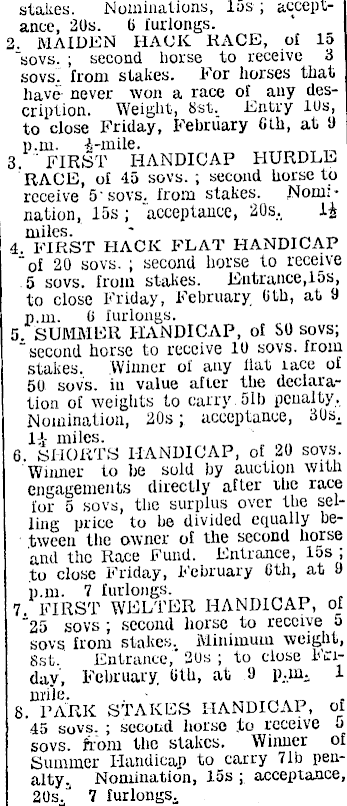 stakes. Nominations, IDs ; acceptance, 20s. 0 furlongs. MAIDEN HACK KACE, of 15 sovs. ; second horse to receive 3 sovs. from stakes. For horses that have- never won a race of any description. Weight, Kst. Entry 10s, to close Friday, February Oth, at 0 p.m. 4-mile. 3. FIRST HANDICAP HURDLE RACE, of 45 sovs. ; second horse to receive s'sovs. from stakes. Nomination, Iss ; "acceptance, 20s. 14 miles. 4. FIRST I-lACK FLAT HANDICAP of 20 sovs. ; second horse to receive 5 sovs. from stakes. Entrance,lDs, to close Friday, February Oth, at 9 n.m. 0 furlongs. 5. SUMMER HANDICAP, of SO sovs; second horse to receive 10 sovs. from stakes. Winner of any flat race of 50 sovs. in value after the declaration of weights to carry 51b penalty, Nomination, 20s; acceptance, 30s. I t miles. 6 SHORTS HANDICAP, ot 20 sovs. Wnmer to be sold by auction with engagements directly after the race for 5 sovs, the surplus over the selling price to be divided ecjually between the owner of the second horse and the Race Fund. Entrance, 15s ; to close Friday, February 6th, at 9 p.m. 7 furlongs. 7. FIRST WELTER HANDICAP, of "25 sovs ; second horse to receive 5 sovs, from stakes. Minimum weight, Bst. Entrance, 2(Js ;to close Friday, February Oth, at 9 pan. 1 s/T’ARK STAKES HANDICAP, of 45 sovs. ; second horse to receive j sovs. from the stakes. Winner of Summer Handicap to carry 71b penalty. Nomination, 15s ; acceptance, 20s/ 7 furlongs.