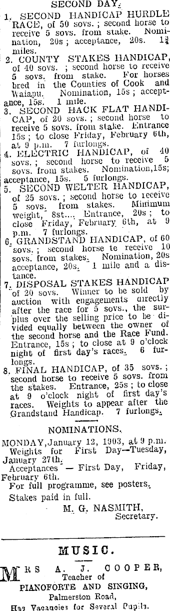 SECOND DAY; 1 SECOND HANDICAP HURDLE RACE, of 50 so vs. ; second horse to receive 5 sovs. from stake. Nomination, 20s ; acceptance, 20s. 1 miles. 2. COUNTY STAKES HANDICAP, of 40 sovs. ; second horse to receive 0 sovs. from stake. For horses bred in the Counties of Cook and Waiapu. Nomination, 15s ; acceptance, 15s. 1 mile. 3. SECOND HACK FLAT HANDICAP, of 20 sovs. ; second horse to receive 5 sovs. from slake. Entrance 15s ; to close Friday, February oth, at 0 p.m. 7 furlongs. 4. ELECTRIC HANDICAP, oi 40 sovs. ; second horse to receive 5 sovs. from stakes. Nomination,lss; acceptance, 15s. 5 furlongs. 5. SECOND WELTER HANDICAP, of 25 sovs. ; second horse to leceive 5 sovs. from stakes. Minimum weight,' Sst.... Entrance, 20s ; to close Friday,' February 6th, at !) p.m. 7 furlongs. C. GRANDSTAND HANDICAP, of 60 'sovs. ; second horse te receive 10 sovs.' from stakes, Nomination, 20s acceptance, 20s, 1 mile and a dis7. STAKES HANDICAP "of 20 sovs. Winner to be sold by auction with engagements directly after the race for 5 sovs., the surplus over the selling price to be divided equally between the owner of the second horse and the Race Pond. Entrance, 15s ; to close at 9 o clock night of first day’s races, 6 fur8. FINAL HANDICAP, of 35 sovs. ; second horse to receive 5 sovs. from the stakes. Entrance, 25s ;to close at 9 o’clock night of first day s races. Weights to appear after the Grandstand Handicap. 7 furlongs, NOMINATIONS. MONDAY,January 12, 1903, at 9 p.m. Weights for First Day—Tuesday, January 27 th. Acceptances First Day, Friday, February 6th. For full programme, see posters, Stakes paid in full. M. G. NASMITH, Secretary. MUSIC. ifKS A. J. COOPER, a Teacher of PIANOFORTE AND SINGING, Palmerston Road, Has Vaeaaoiee for Several PuplU.