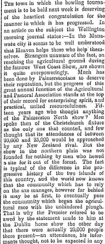 The town in which the bowling tournament is to be held next week is deserving of the heartiest congratulation for tko manner in which it has progressed. In an article on the subject the Wellington morning journal states • —ln the Manawatu city it seems to bo well understood that Heaven helps those who help' themselves. Strangers unaware of the fact, on reaching the agricultural ground during the famous West Coast Show, t are shown it quite overpoweringly. Much has been dono by Palmerstonians to deserve their reputation, but tho progress of this great annual function of the Agricultural and Pastoral Association stands at the top of their record for enterprising spirit, and practical, united resourcefulness. Fifteen years ago who thought anything of tho Palmerston North show ? Men spoke then of the Christchurch fixture as the only one that counted, and few thought that its attendances of between 20,000 and 25,000 would be approached by any New Zealand rival. But the show in tho northern plain was not founded for nothing by men who hewed a site for it out of the forest. The fact is typical of the difference in tho progressive history of the two islands of this country, and the world now knows that tho community which has to rely on the axe manages, however far behind it may be at first, to eventually pass the community which began the agricultural race with the unhindered plough. That is why the Premier refused to be awed by the statement made to him at the Dublin horse show tho other day that there wero actually 20,000 people thcro present —an attendance, his informants thought, not to be expected in any