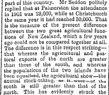 part of this country. Mr Seddon politely replied that at Palmorston the attendance in 1901 was 23,000, while at Christchurch the same year it had reached 30,000. That is the measure of the presont difference between the two great agricultural functions of New Zealand, which a few years ago could not be compared together at all. The difference is in this respect striking—that whereas the agricultural and pastoral exports of the north are greater than those of the south, and whereas the populations of the two islands have been equalised, tho agricultural show—the annual stock-taking, »» it-wero—or the south is still greater than that of the north. This has evidently sttuck the