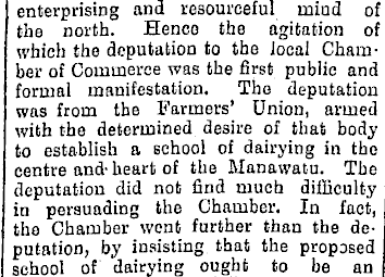 enterprising and resourceful mind of the north. Hence the agitation of which the deputation to the local Chamber of Commerce was the first public and formal manifestation. Tho deputation was from the Farmers’ Union, armed with the determined desire of that body to establish a school of dairying in the centre and-heart of the Manawatu. The deputation did not find much difficulty in persuading the Chamber. In fact, the Chamber went further than the deputation, by insisting that the proposed school of dairying ought to be an