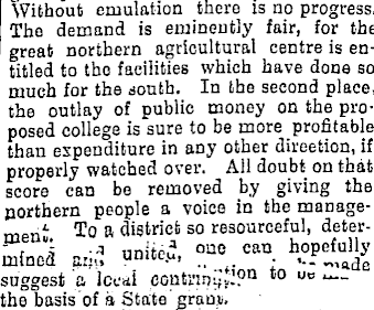 Without emulation there is no progress, Tho demand is eminently fair, for the great northern agricultural centre is entitled to tho facilities which have done so much for the south. In the second placethe outlay of public money on the proposed college is sure to be more profitable than expenditure in any other direetion, if properly watched over. All doubt on that score can be removed by giving the northern people a voice in the managers To a district so resourceful, determined tmq ™tcd, °. Ue , Can - h .°- P IS suggest a local conti'nufd? 11 *° uc **~ . the basis of a State gram,