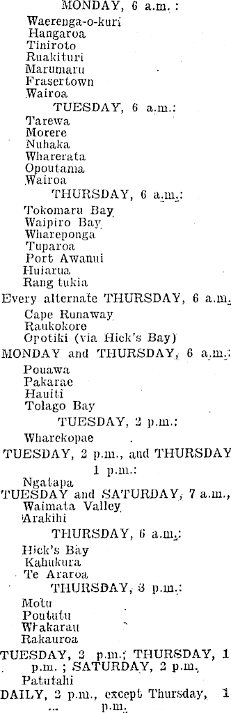 MONDAY, 6 a.m. : Waerenga-o-kuri Hangaroa Tiniroto Ruakituri Marumaru Frasertown .Wairoa TUESDAY, 6 a.m.: Tarewa Morere Nuhaka Wharerata Opoutama .Wairoa THURSDAY, 6 a.m.: Tokomaru Bay Waipiro Bay Whareponga Tuparoa Port Awanui I-luiarua Rang tukia Every alternate THURSDAY, 6 a.m. Cape Runaway Raukokore Opotiki (via Hick’s Bay) MONDAY and THURSDAY, 6 a.m,: Pouawa Pakarae Hauiti Tolago Bay TUESDAY, 3 p.m.: Wharekopae TUESDAY, 3 p.m., and THURSDAY 1 p.m,: Ngalapa TUESDAY and SATURDAY, 7 a.m., Waimata Valley Arakihi THURSDAY, li a.m.: Hick’s Bay Kaliukura Te Araroa THURSDAY, 3 p.m,: Mo’tu Poututu Wlakarau Rakauroa TUESDAY, 3 p.m.; THURSDAY, 1 p.m. ; SATURDAY, 3 p.m, Patutahi DAILY, 3 p.m., except Thursday, 1 p.m.