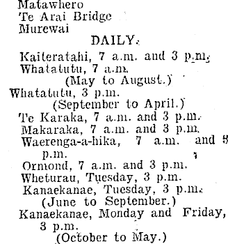 Matawhero Te Alai Bridge Murewai DAILY.: Kaileratahi, 7 a.m. and 3 p.m* Whatatutu, 7 a.m. (May to August.)' ■Whatatutu, 3 p.m. (September to April.) Te Karaka, 7 a.m. and 3 p.m. Makaraka, 7 a.m. and 3 p.m. Waerenga-a-hika, 7 a.m. and 3 p.m. _ i Ormond, 7 a.m. and 3 p.m. Wheturau, Tuesday, 3 p.m. Kanaekanae, Tuesday, 3 p.m.: (June to September.) Kanaekanae, Monday and Friday, 3 p.m. (October to May.)