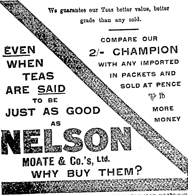 We guarantee our Teas better value, better grade than any sold. TO BE m ■m EVEN WHEN TEAS ARE SAID COMPARE OUR 2/- CHAMPION WITH ANY IMPORTED IN PACKETS AND SOLD AT PENCE MORE MONEY JUST AS GOOD AS NELSON MOATE & Co.’s, lm. WHY BUY THEM?