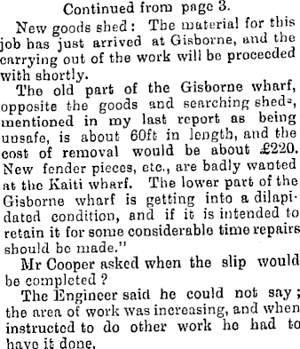 Continued from page 3. New goods shed : The material for this job has just arrived at Gisborne, and the carrying out of the work will be proceeded with shortly. , , , The old part of the Gisborne whart, opposite the goods and searching shed a , mentioned in my last report as being uusafe, is about 60ft in length, and the cost of removal would be about £220. New fender pieces, etc., are badly wanted at the Kaiti wharf. The lower part of the Gisborne wharf is getting into a dilapidated condition, and if it is intended to retain it for some considerable time repairs should be made.” Mr Cooper asked when the slip would be completed ? The Engineer said he could not say ; the area of work was increasing, and when instructed to do other work he had to have it done.