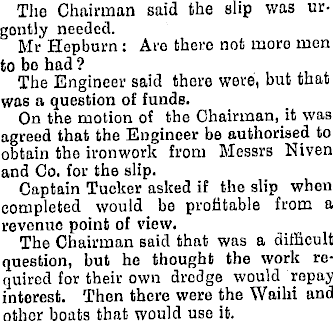 The Chairman said the slip was urgently needed. Mr Hepburn : Are there not tnoro men to be had? The Engineer said thoro were, but that was a question of funds. On the motion of the Chairman, it was agreed that the Engineer be authorised to obtain the ironwork from Messrs Niven and Co. for the slip. Captain Tucker asked if the slip when completed would bo profitable from a revenue point of view. The Chairman said that was a difficult question, but he thought the work required for their own dredge would repay intorest. Then there were the Waihi and other boats that would use it.