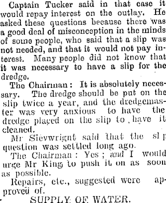 Captain Tucker said in that ease it would repay interest on the outlay. Ho asked these questions because there was a good deal of misconcoption in the minds of some people, who said that a slip was not needed, and that it would not pay interest. Many people did not know that it was necessary to have a slip for the dredge. The Chairman : It is absolutely necessary. The dredge should bo put on the slip twice a year, and the dredgemasler was very anxious to have the dredge placed on the slip to , have it cleaned. . , Mr STevwrignt said that the si p question was settled long ago. The Chairman : Yes ; and I would urge Mr King to push it on as soon as possible. Repairs, etc., suggested were approved of. .SUPPLY; OP WATER.