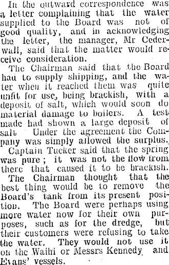 In the oittwavd correspondence was a letter complaining that the water supplied to the Board was not ol good quality, and in acknowledging Uiq letter, the manager, Mr Cederwull, said that the matter would receive consideration. The Chairman said that the Board had to '.supply shipping, and the water when it reached them was quite unfit for usCj being brackish, with a deposit ol salt, which would soon do material damage to boilers. A Lest made had shown a large deposit ol salt Under the agreement the Company was simply allowed the surplus. Captain Tucker said that the spring was pure ; it was not the llow from there that caused it to he brackish. The Chairman thought that the best thing would be. to remove the Board’s tank from its present position. The Board were perhaps using more water now for their own purposes, such as for the dredge, but* their customers were refusing to take the water. They would not use it on the Waihi or Messrs Kennedy and Evans’ vessels.