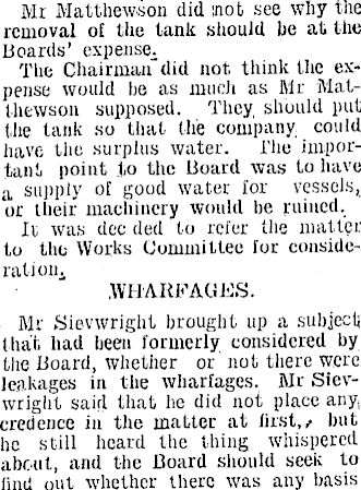 Mr Matthewson did mot see why the removal of the tank should he at the Boards’ expense. The Chairman did not, think the expense would he as much as Mr Matthewson supposed. They should put the tank so that the company could have the surplus water. The important point to the Board was to have a supply of good water for vessels, or their machinery would he ruined. It was dec ded to refer the matter to the Works Committee for consideration. .WHARFAGES. Mr Sievwright brought up a subject that had been formerly considered by the Board, whether or not there were leakages in the wharfages. Mr Sievwright said that he did not place any credence in the matter at first, f but he still heard the thing whispered about, and the Board should seek to find out whether there was any basis