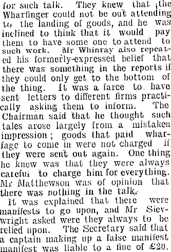 ! for such talk. They knew that jthe Wharfinger could not he out attending to the landing of goods, and he was inclined to think that it would pay them to have some one to attend to such work. Mr Wliinray also repeated his formerly-expressed belief that there was something in the reports if they could only get to the bottom of the thing. It was a farce to. have sent letters to different firms practically asking them to inform. The Chairman said that he thought such tales arose largely from a mistaken impression ; goods that paid wharfage to come in were not charged if they were sent out again. One thing he knew was that they were always caiefui to charge him for everything. Mr Matthewson was of opinion that there was nothing in the tally.; It was explained that there were manifests to go upon, and Mr Sievwright asked were they always to he rc-lied upon. The Secretary said that a captain making up a false manifest manifest was liable to a line of £2O.