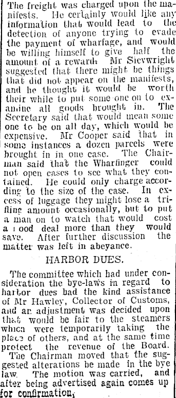 The freight was charged upon the manifests. He certainly would like any information that would lead to the detection of anyone trying to evade the payment of wharfage, and would he willing himself to give half the amount, of a rewards Mr Sicvwright suggested that there might be things that did not appear on the manifests, and he thought it would be worth their while to put some one on to examine all goods brought in. The Secretary said that would mean some one to be on all day, which W'otild be expensive. Mr Cooper said "that in some instances a dozen parcels were brought: in in one case. The Chairman said that the Wharfinger could not open cases to see what they contained. lie could only charge according to the size of the case. In excess of luggage they might lose a trilling amount occasionally, but to put a man on to watch that would cost a i ood deal more than they would save. After further discussion the matter was left in abeyance. I-lARBOR DUES. The committee which had under consideration the bye-laws in regard to harbor dues had the kind assistance of Mr Hawley, Collector of Customs, and an adjustment was decided upon that would be fair to the steamers whicn were temporarily taking the place of others, and at the same time protect (he revenue of the Board. The Chairman moved that the suggested alterations he made in the bye law The motion was carried, and after being advertised again comes up for confirmation!