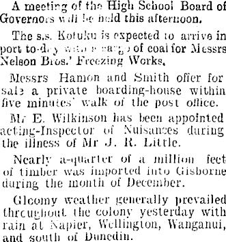 A meetirg of the High School Board of Governors v. Ji he held this afternoon, The s.s. liofuku is expected to arrive in port to d, y iv:t.i r car*, > of coai for .Messrs Nelson Bros.’ Freezing Works, Messrs Idanion and .Smith offer for sal3 a private boarding-house within five minutes' walk of tlie post oliice. Mr E. Wilkinson has been appointed acting-inspector of Nuisances during the illness of Mr J. It- Little. Nearly a-quartcr of a million feet of timber was imported into Gisborne during the month of December. Gloomy weather generally prevailed threughoul, the colony yesterday with rain at Napier, Wellington, Wanganui, and south of Dunedin.