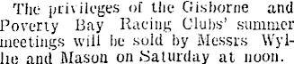 The prhilcges of the Gisborne and Poverty Bay Racing Clubs’ summer meetings will be sold by Messrs Wyllie and Mason on Saturday at noon.