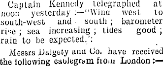 Captain Kennedy telegraphed at noon yesterday “Wind west to south-west and south ; barometer rise ; sea increasing ; uues good ; rain to he expected.’: Messrs Dalgety anu Go. have received the following cablegram fiom London: —