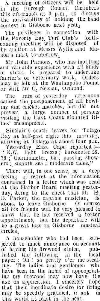 A meeting of citizens will he held in the Borough Council Chambers this afternoon at 3 p.m., to discuss the advisability of holding the band contest iti Gisborne next yeatj The privileges in connection with Hie Poverty Bay, Turf Club’s forthcoming meeting will be disposed of by auction at Messrs Wyllie .and Mason's mart 10-morrow,. Mr John Parsons, who has had.long and valuable experience with all kinds of stock, is prepared to undertake farrier's or veterinary work. Orders may he left at Uic Wnataupo’ko Pound or with Mr U N'eeiian, Ormond. The rain of yesterday afternoon caused the postponement of all howling and cricket matches, but did not prevent a large number of persons visiting the East Coast Mounted Kibes’ encampment. Sinclair’s coach leaves for Tolago Bay at half-past eight this morning, arriving at Tolago at about four p.m. Yesterday East Cape reported “ NAY. light breeze ; barometer 39. 7!) thermometer, 05 ; passing showers ; smooth sea ; moderate tides.’’ There will, in one sense, be a deep feeling of regret at the information contained in a letter which was read at the Harbor Board meeting yesterday, -being to the effect that Mr H. D. Parker, the capable musician, is about to leave Gisborne. Of course all 1:1s friends will be very pleased to know that he has received a better appointment, but his departure will he a great loss to Gisborne musical circles. A householder who had been subjected to much annoyance on account of having his firewood stolen, published the following in the local paper : Oh ! so gently o’er me stealing. The ladies and gentlemen who have been in the habit of appropriating my firewood may now have the axo on application. 1 sincerely hope that their inordinate desiro for firing may he speedily gratified, if not in this world at least in the next.