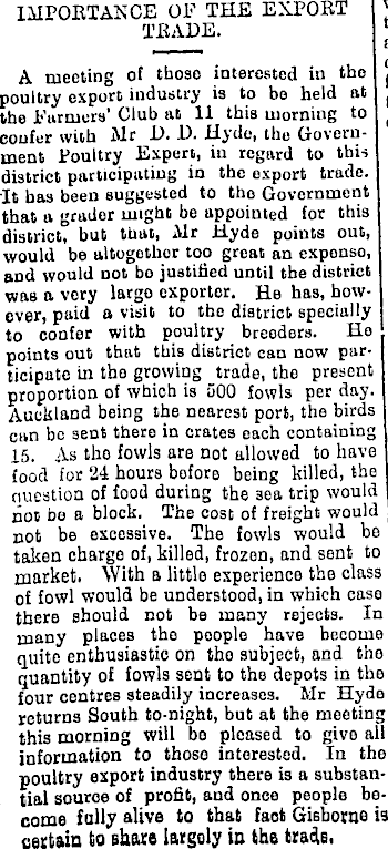 IMPORTANCE OE THE EXPORT " TRADE. 11 A mooting of tboso interested in the j poultry export industry is to bo held at the Farmers' Club at 11 this morning to coufer with Mr D. D. Hyde, the Government Poultry Expert, in regard to this j district participating in the export trade. ( It has been suggested to the Government that a grader might be appointed for this f district, hut that, Mr Hyde poiuts out, ' would bo altogether too great an exponso, j and would not bo justified until the district was a very largo exporter. He has, how- . ever, paid a visit to tho district specially to confer with poultry breeders. Ho points out that this district can now participate in tho growing trade, tho present proportion of which is 500 fowls per day. Auckland being the nearest port, the birds can be sent there in crates each containing 15. As the fowls are not allowed to have food for 24 hours before being killed, the nuestion of food during the 3ea trip would not do a block. The cost of freight would not be excessive. Tho fowls would be takon charge of, killed, frozen, and sent to market. With a little experience tho class of fowl would be understood, in which case there should not be many rejects. In many places tho people have become quite enthusiastic on tho subject, and tho quantity of fowls sent to the depots in tho four centres steadily increases. Mr Hyde returns South to-night, but at the meeting this morning will bo pleased to give all information to those interested. In the poultry export industry there is a substantial source of profit, and once people become fully alive to that faot Gisborne is certain to share largely in the trade,