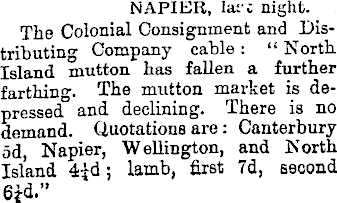 NAPIER, lace night. The Colonial Consignment and Distributing Company cable: “ North Island mutton has fallen a further farthing. The mutton market is depressed and declining. There is no demand. Quotations are : Canterbury sd, Napier, Wellington, and North Island 4-jd; lamb, first 7d, second 6fd.”