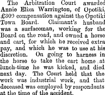 The Arbitration Court awarded Annie Eliza Warrington, of Opotiki, £309 compensation against the Opotiki Town Board. Claimant’s husband was a surfaceman, working for the Board on the road, and owned a horse and cart, for which he received extra pay, and which he was to use at his discretion. On going to harness in the horse to take the cart home .at lunch-time he was kicked, and died next day. The Court held that the work was industrial work, and that deceased was employed by respondents at the time of the accident.