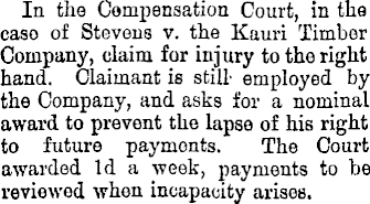 In the Compensation Court, in the caso of Stevens v. the Kauri Timber Company, claim for injury to the right hand. Claimant is still employed by the Company, and asks for a nominal award to prevent the lapse of his right to future payments. The Court aw T arded Id a week, payments to be reviewed when incapacity ariseß.
