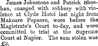 James Johnstone and Patrick Sheehan, cnarged with robbery with violence at Clyde Hotel last night from Makoare Pex>uore, wore before the Magistrate’s Court to-day, and were committed to trial at the Supreme Court at Napier, The sum stolen was £3.