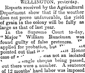 WELLIN GTO N, yes ter day. Reports received by the Agricultural Doxmrtment show that if the woather does not prove unfavorable, the yield of grain in the colony will be fully as large as that of last year. In the Supreme Court to-day, “Major” William Runciman was found guilty of false pretences. Tr applied for probation, but TT " J - L0 pointed out that R - -‘-‘.is. Honor case of ° - ' vas no * i an ls °l a^e d 1 single cheque being passed, out there were a number. A sentence of 12 months’ hard labor was imposod.