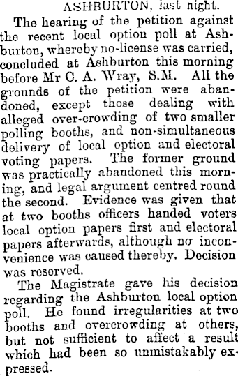 ASHBURTON, last night. ■ The hearing of the petition against the recent local option poll at Ashburton, whereby no-license was carried, concluded at Ashburton this morning before Mr C. A. Wray, S.M. All the grounds of the petition were abandoned, except those dealing with alleged over-crowding of two smaller polling booths, and non-simultaneous delivery of local option and electoral voting papers. The former ground was practically abandoned this morning, and legal argument centred round the second. Evidence was given that at two booths officers handed voters local option papers first and electoral papers afterwards, although na inconvenience was caused thereby. Decision was reserved. The Magistrate gave his decision regarding the Ashburton local option poll. He found irregularities at two booths and overcrowding at others, but not sufficient to affect a result which had been so unmistakably expressed.