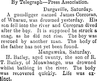 By Telegraph—Press Association. Dargaville, Saturday. A gumdigger named James Corcoran, of Wharau, was drowned yesterday. His son fell into the river and Corcoran dived after the boy. It is supposed he struck a snag, as he did net rise. The boy was rescued by another man. The body of the father has not yet been found. Mangaweka, Saturday. H. Hatley, aged twenty, the son of R. T. Batley, of Moawhango, was drowned whilst bathing in the river. The body was recovered quickly. Life was extinct'.