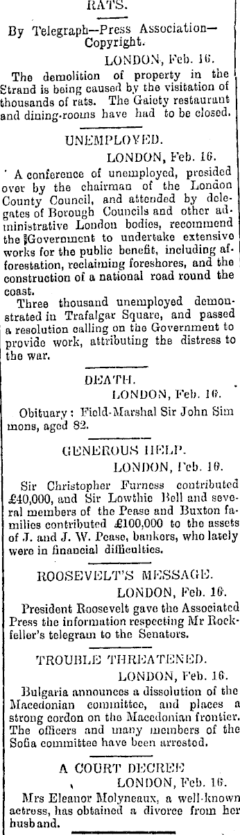 RATS. By Telegraph—Press AssociationCopyright. LONDON, Feb. 16. The demolition of property in the Strand is being caused by tho visitation of thousands of rats. The Gaiety restaurant and dining-rooms have had to be closed. UNEMPLOYED. LONDON, Fell. 16. ' A conference of unemployed, prosidod over by the chairman of the London County Council, and attended by delegates of Borough Councils and other administrative London bodios, recommend the to undertake extensive works for the public benefit-, including afforestation, reclaiming foreshores, and the construction of a national road round the coast. Three thousand unemployed demonstrated in Trafalgar Square, and passed a resolution calling on the Government to provide work, attributing the distress to tho war. DEATH. LONDON, Feb. 16. Obituary : Field-Marshal Sir John Sim mons, aged 82. GENEROUS HELP. LONDON, I’cb. 16. Sir Christopher Furness contributed £40,000, and Sir Lowthie 801 l and several members of tho Pease and Buxton families contributed £IOO,OOO to the assets of .T. and J. W. Pease, bankors, who lately were in financial difficulties. ROOSEVELT’S M ESS AGE. LONDON, Feb. 16. President Roosevelt gave the Associated Press the information respecting Mr Roekfeller’s telegram to tho Senators. TROUBLE THREATENED. LONDON, Feb. 16. Bulgaria announces a dissolution of tho Macedonian committee, and places a strong cordon on tho Macedonian frontier. The officers and many members of the Sofia committee have been arrested. A COURT DECREE , LONDON, Feb. 16. Mrs Eleanor Mol.yneuux, a well-known actress, has obtained a divorce from her husband.