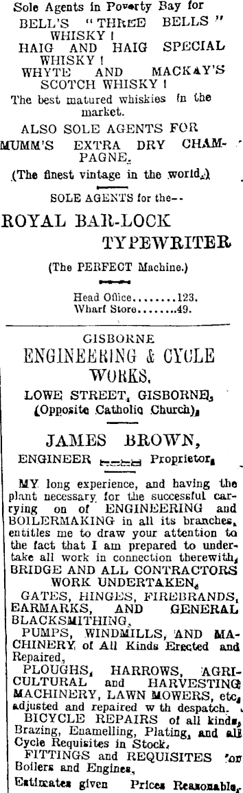 Sole Agents in Poverty Bay for BELL’S “ THREE BELLS ” WHISKY ! HAIG AND HAIG SPECIAL WHISKY I WHYTE AND MACK AY S SCOTCH WHISKY ! The best matured whiskies fn the market. ALSO SOLE AGENTS FOR MUMM’S EXTRA DRY CHAM- ' PAGNE, (The finest vintage in the world..) SOLE AGENTS for the--ROYAL BAR-LOCK TYPEWRITER (The PERFECT Machine.) Head Office 123. Wharf Store 49. GISBORNE ENGINEERING & CYGLE WORKS, LOWE STREET,, GISBORNE., (Opposite .Catholiq Churchy JAMES BROWN, ENGINEER , Proprietor, MY long experience, and having the plant necessary for the successful carrying on of ENGINEERING and BOILERMAKING in all its branches, entitles me to draw your attention ta the fact that I am prepared to undertake all work in connection therewith, BRIDGE AND ALL CONTRACTORS WORK UNDERTAKEN, GATES, HINGES, FIREBRANDS, EARMARKS, AND GENERAL BLACKSMITHING, PUMPS, WINDMILLS, AND MACHINERY of All Kinds Erected and Repaired, PLOUGHS, HARROWS, AGRICULTURAL and HARVESTING MACHINERY, LAWN MOWERS, etCj adjusted and repaired wth despatch. . BICYCLE REPAIRS of all kinds, Brazing, Enamelling, Plating, and all Cycle Requisites in Stock, FITTINGS and REQUISITES ’on Boilers and Engines, Estimates given Prices Reasonably