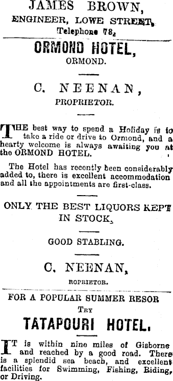 JAMES BROWN, ENGINEER, LOWE STREET Telephone 78 ; ORMOND HOTELS ORMOND. 0. NEE NAN, PROPRIETOR. ITIHE best way to spend a Holiday i'a to JL tako a ride or drive to Ormond, and a hearty welcome is always awaiting yon at the ORMOND HOTEL. Tho Hotel has recontly been considerably added to, there is excellent accommodation and all the appointments are first-claea. ONLY THE BEST LIQUORS KEPT IN STOCKS GOOD STABLING. C, NEENAN, ROPRIETOR. FOB A POPULAR SUMMER RESOR ~ Try HOTEL, IT is within nine miles of Gisborne and reached by a good road. There is a splendid sea beach, and excellent facilities for Swimming, Fishing, Biding, or Driving.