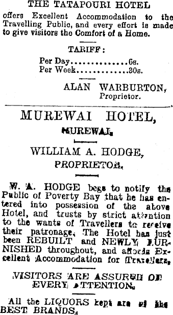 THE TATAPOURI HOTEL offers Excellent Accommodation to the Travelling Publio, and every effort ia made to give visitors the Comfort of a Home. TARIFF: Per Day Gs. Per Week 30s. ALAN WARBURTON, Proprietor. murewai hotel, NUREWAJ* WILLIAM A. HODGE, PROPRIETOR W. A. HODGE begs to notify this Public of Poverty Bay that he has entered into possession of the above Hotel, and trusts by strict attention to the wants of Travellers ta receive their patronage* The Hotel ban Just been REBUILT and NEWLTi BURNISHED throughout, and affords Excellent Accommodation for fTrase.'Jer*, VISITORS ARE ASSURED OJ3 EVERT ATTENTION) All the LIQUORS BEST BRANDS,* kept are el ikj