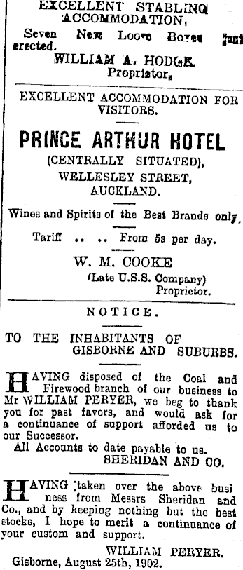 EXCELLENT STABLING! ACCOMMODATION, Seven New Loo»e B.o T es tat WILLIAM A, HODfeK, Proprietor, EXCELLENT ACCOMMODATION FOB VISITORS. PRINCE ARTHUR HOTEL (CENTRALLY SITUATED), WELLESLEY STREET, AUCKLAND. Wines and Spirits ol the Beet Brands only Tarifi ~ ~ From 5s per day. W. M. COOKE 'Late U.S.S. Company) Proprietor. NOTICE. TO THE INHABITANTS OF GISBORNE AND SUBURBS. HAVING disposed of the Coal and Firewood branch of our buainesß to Mr WILLIAM PERYER, we beg to thank you for past favorß, and would ask for a continuance of support afforded us to our Successor. All Accounts to date payable to ua. SHERIDAN AND CO. HAVING jtaken over the above busi ness from Messrs Sheridan and Co., and by keeping nothing but the best stocks, I hope to merit a continuance of your custom and support. WILLIAM PERYER. Gisborne, August 25th, 1902.