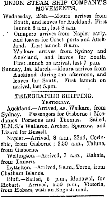 .UNION STEAM SHIP COMPANY’S MOVEMENTS, Wednesday, 25th,—Moura arrives from South, and leaves for Auckland. Eirst launch 6 a.m., last 8 a.m. Omapero arrives from Napier early, and loaves for Coast ports and Auckland. Lust launch 8 a.m. Waikaro arrives from Sydney and Auckland, and loaves for South. First launch on arrival, last 7 p.m. Sunday, Ist. March. —Moura arrivos from Auckland during the afternoon, and loaves for South. First launch on arrival, last s.pm. TELEGRAPHIC SHIPPING. Yesterday. Auckland.—Arrived, s.s. Waikaro, from Sydnoy. Passengers for Gisborno : Biosdames Portoous and Thomas. Sailed, H.M.S.’s Wallaroo, Archor, Sparrow, and Lizard for Russell. Napier.—Arrivod, 8 a.m., 22nd, CorinShic, from Gisborno ; 3.80 a,in., Taluno, from Gisborno. Wellington.—Arrived, 7 a.m., Raknin, from Tirnnru. Lyttoltou.—Arrivod, 8 a.m., Toroa, from Chatham Islands. Bluff.—Sailed, 5 p.m., Monowai, for Moburt. Arrivod, 5.50 p.m., Victoria, from Hobart, with an English mail.