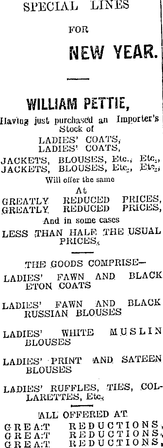 SPECIAL LINES FOR NEW YEAR. WILLIAM PETTIE, Having just purchased an Importer’s Stock of LADIES’ COATS, LADIES’ COATS, JACKETS, BLOUSES, Etc., Etc,, JACKETS, BLOUSES, Etc., Etc.; Will oiler the same At REDUCED PRICES, REDUCED PRICES, GREATLY .GREATLY And in some cases LESS THAN HALF. THE USUAL PRICES,; THE GOODS COMPRISE—LADIES’ FAWN AND BLACK ETON, COATS LADIES’ FAWN AND BLACK RUSSIAN BLOUSES LADIES’ WHITE MUSLIN BLOUSES LADIES’ PRINT 'AND SATEEN BLOUSES LADIES’ RUFFLES, TIES, COLLARETTES, Etc.; ALL OFFERED AT. G-RE A:T GREA:T G. R E A:T REDUCTIONS, reductions., reductions,