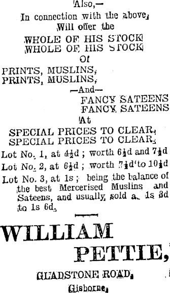 Also,— Jn connection with ilie above, Will oSer the WHOLE OF HIS STOCK WHOLE OF. HIS STOCK OI PRINTS, MUSLINSj PRINTS, MUSLINS, —And— FANCY SATEENS FANCY, SATEENS At SPECIAL PRICES TO CLEAR, SPECIAL PRICES TO CLEAR,; Lot No, 1, at did ; worth 6id and 7id Lot No, 2, at 6id ; worth !?id‘tolOid Lot No. 3, at Is ; being the balance of the best Mercerised Muslins and Sateens, and usually, sold a. Is on to Is 6d, WILLIAM PETTIE, GLADSTONE ROAD, Gisborne,